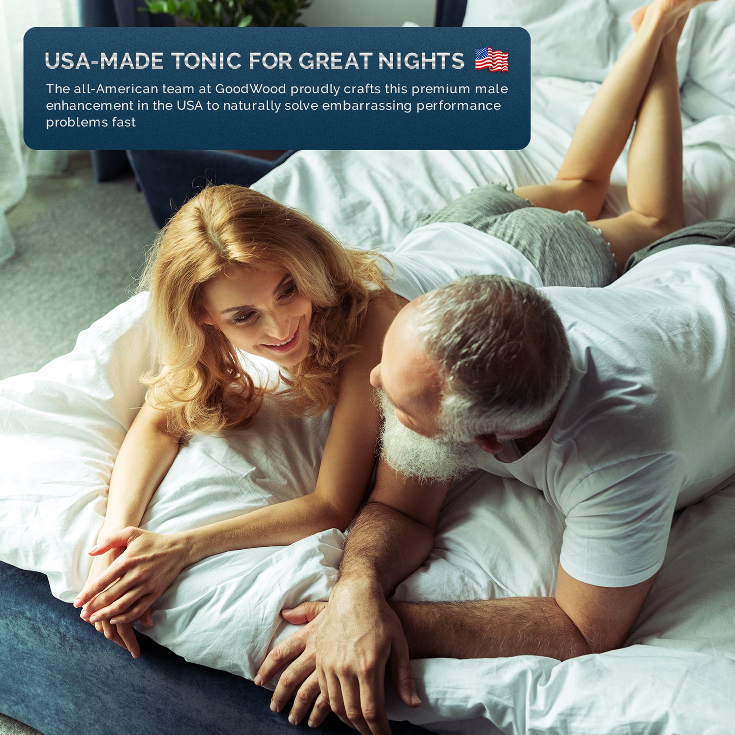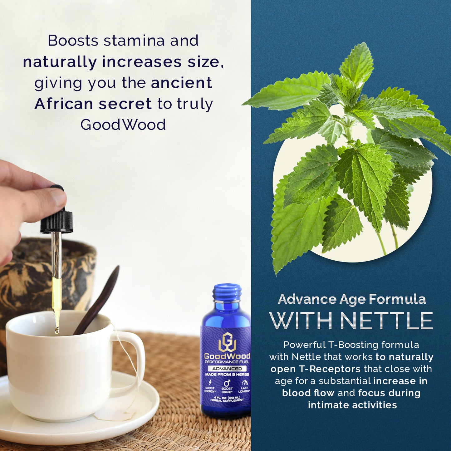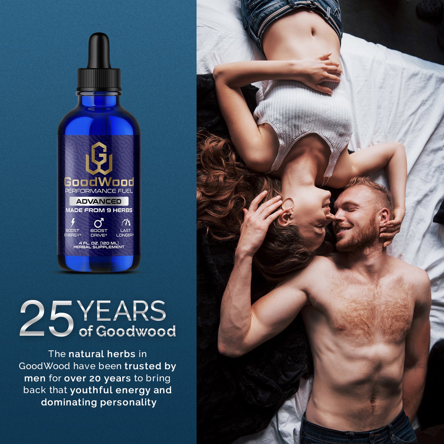 GoodWood Advanced is an all-natural liquid herbal formula designed specifically for older men who need to halt the loss of testosterone as it changes to estrogen or becomes bound and not free to create erections.